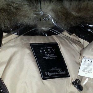 All zippers on the coat - 1 front and 4 on pockets have logo "Elsy" round hardware detail with rhinestone in the middle