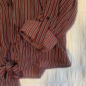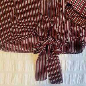 NWT EM cropped button up blouse in burgundy/black/white stipe. Tie up bottom detail. Size Small. 100% Polyester (silky feel fabric). Spare button.