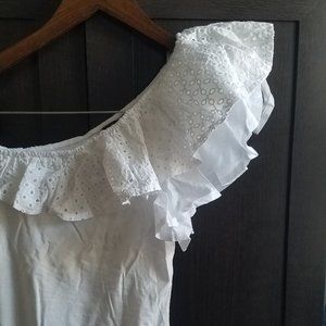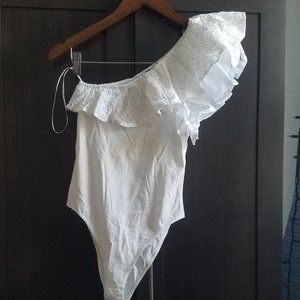 NWT EMBROIDERED ASYMMETRIC ONE SHOULDER WHITE BODYSUIT.