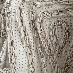 I'm a size 36, but I cannot resist to buy this skirt when it was on sale (still very expansive), Solely because the skirt itself is like an artwork. The two layer design, an elegant A-line silk skirt veiled with a tulle patterned with relief-carving-like ruffled trim, mix elegant and swanky seamlessly.
