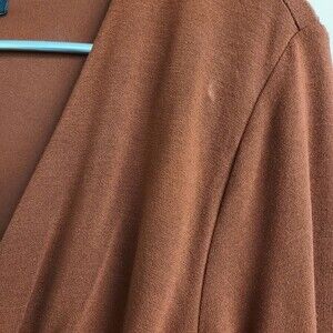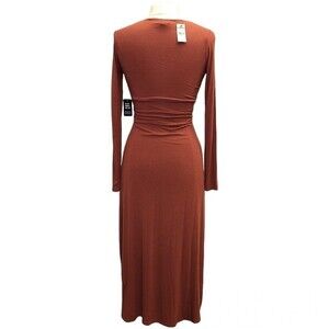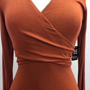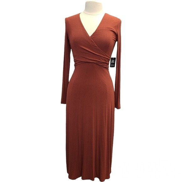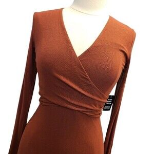Women's EXPRESS Terracotta Knit V- neck Long Sleeve Cross Front Knit Date Night Comfortable Casual Midi Dress. Brand new with tags. V-neck; Cross front design; Long sleeves. Knit fabric; fully lined. Straight hem; Midi length.