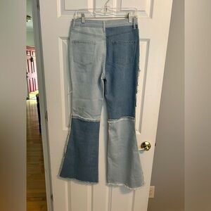 Chic color block jeans with frayed edges. Flared style light wash. Fabulous style. Size Large. New with tags