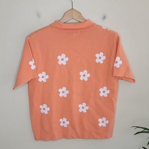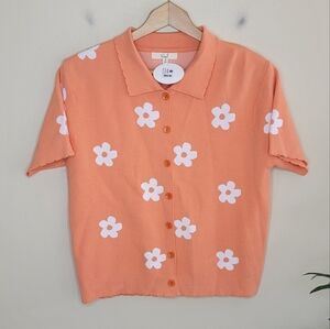Easel | Orange & White Daisy Floral Print Button Front Short Sleeve Sweater