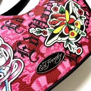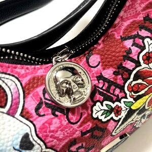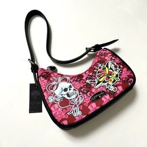 NWT Ed Hardy Asymmetrical Shoulder Bag Skull Butterfly Tattoo Print Pink Black