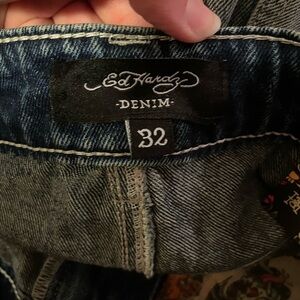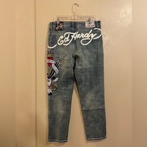 NWT Ed Hardy men’s Embroidered NYC Skull jeans. Size 32. Mid wash in color. Slim fit, five pocket distressed styling. Ed Hardy logo printed at rear and sweet embroidered retro tattoo inspired skull design at leg.
