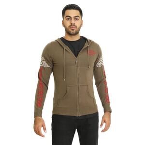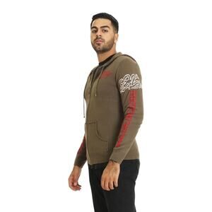 Ed Hardy Hooded Wool/Alpaca Blend Zip Up Knit Sweater in Olive Green