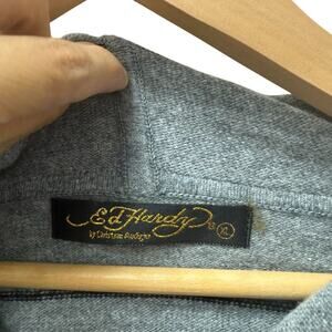 NWT Ed Hardy Mens Patch Knitted Striped Zip Up Hoodie Sweater Gray Size XL