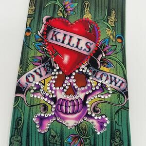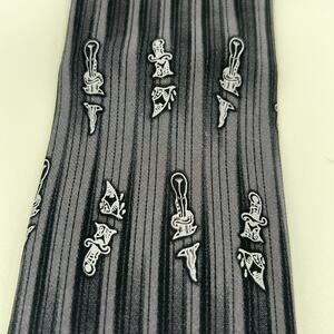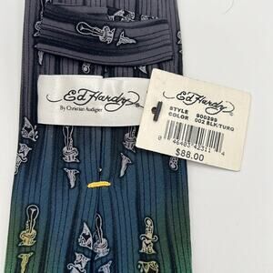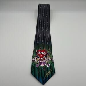 New With Tag Ed Hardy Neck Tie. Unique design for a tie. Mostly a gray vertical stripe design with little knives. Bedazzled Ed Hardy “Love Kills Slowly” at the bottom of the tie. 100% silk.