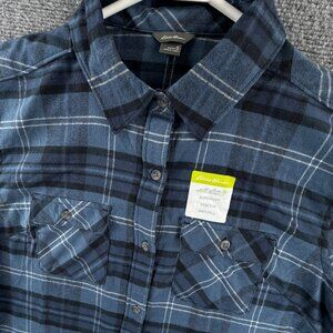 NWT Eddie Bauer Blue Plaid Flannel Button Up Shirt Women Small Soft Pockets