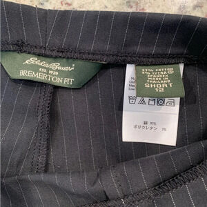 Women’s size 12 short Eddie Bauer stretch twill pants in Bremerton fit. They are black with a white pinstripe. Inseam is 29 inches. Waist stretches and has side hidden zipper and inside button.