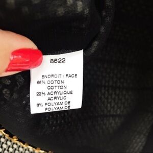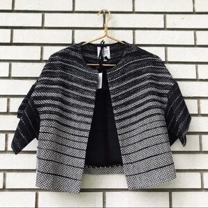 New with tags Edward Achour Paris woven swing jacket in a striking black and white textured stripe pattern. This Parisian designer piece features a structured, sculptural silhouette with short sleeves and a collarless neckline for a modern yet timeless appeal. Crafted from a luxe cotton blend with acrylic and polyamide for durability and shape, it’s fully lined in soft polyester mesh. A signature gold chain detail adorns the inside hem for that extra designer touch. Size 34 (equivalent to US size 4). A standout layering piece perfect for elevating both day and evening looks. Originally retailed for $644—grab it for less!