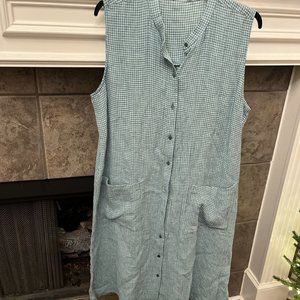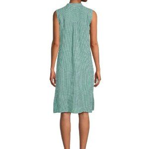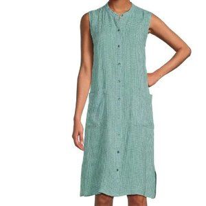 Relaxed and easy. An airy sleeveless dress with a mandarin collar and side slits. Subtly textured in organic linen with a yarn-dyed check. Close at the shoulders, wider at the hem. A silhouette that fits the body with ease. Model is 5'9" and wearing a size small, which measures 41 inches on the body. Petite model is 5'3" and wearing a size petite small, which measures 38 inches on the body. Mandarin collar, sleeveless, button front. Back yoke with center box pleat. Front patch pockets, 6-inch side slits. Mother-of-pearl buttons. Machine wash cold. Made in Indonesia. 100% Organic Linen. Size XS - Bust -36"
