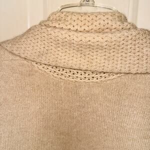 This Eileen Fisher Beige Natural Cashmere Open Cardigan in size 1X is a luxurious addition to any woman's wardrobe. The dolman sleeves and relaxed fit make it stylish and comfortable, while the contrasting knit pattern shawl collar adds a touch of sophistication. Perfect for the winter and fall seasons, this hand wash only sweater is crafted from high-quality cashmere material in a knit fabric type. With its classic design and designer appeal, this cardigan is a versatile and chic choice for any outfit. MSRP - $378