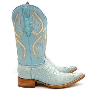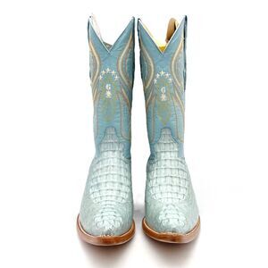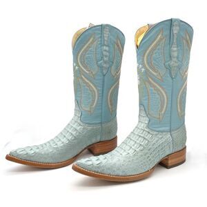 Make a bold entrance at your next rodeo, music festival, or Western event with these statement-making El General cowboy boots. Handcrafted in Mexico with genuine caiman belly leather in a rare icy blue shade, these boots are built to turn heads and hold up in the dust and spotlight.