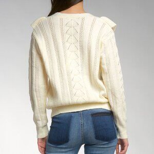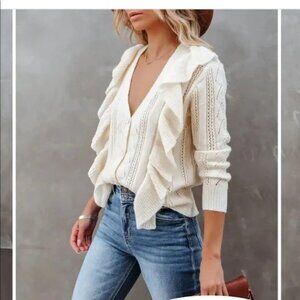 Our ruffle V-neck Sweater will definitely be a charm for your wardrobe. Featuring a front-button down, soft ruffles, and a semi-cropped fit, easily pair with your favorite fall denim or pant for a fun and flirty style. This sweater also wears well to the office or parties when paired with nice pants or a skirt.
