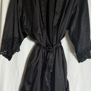 NWT Elegant Black Satin Full Length Lace Trim Robe