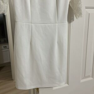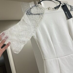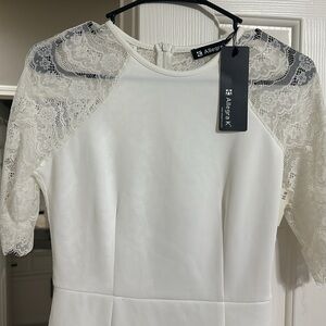 This elegant white dress features delicate lace sleeves, perfect for any special occasion. Its classic design offers a timeless look.