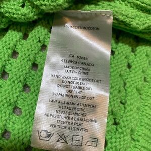 This vibrant green cardigan features an open weave pattern and classic design. 100% Cotton.