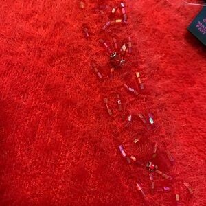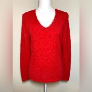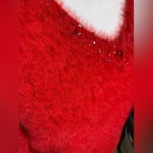 NWT Elena Wang Vibrant Red Eye-Lash V-Neck Jeweled Sweater Women Small