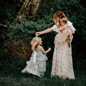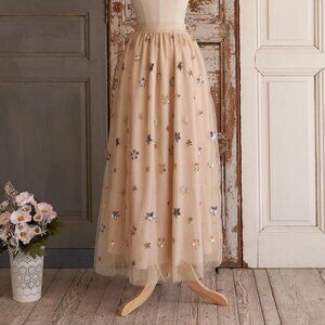 Gorgeous brand new with tags Elestrory Princess tulle maxi skirt. A very special skirt perfect for a costume, a photo shoot or just living your best sparkly life! Whimsical sewn-on sequined star in gold and silver, over a romantic blush peach tulle. Nude elastic waistband with metallic threading that makes it look rose gold. Skirt is fully lined with satin. Lots of volume! Sold out model.