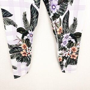 Legging. This comfy compression tight has an all-over floral Tropicana print, a high-waistline with outer drawcord, and moisture wicking performance. Size medium.