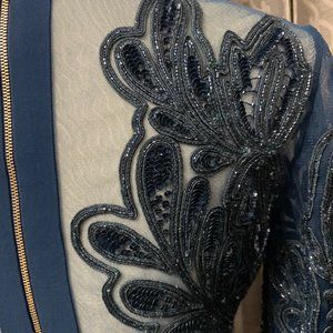 NWT Elie Saab Peacock Blue Sequin Beaded Long Sleeve Gown Dress, Sz 36