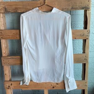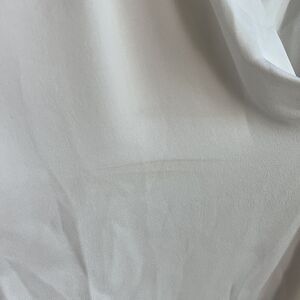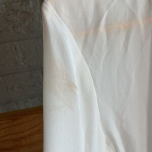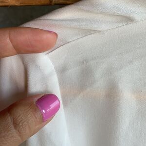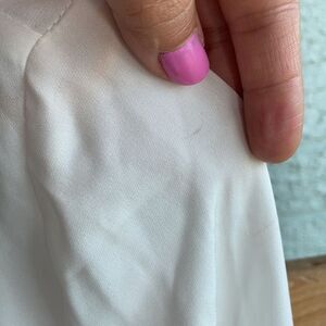 There is a make up like mark on the sleeve and mark in the front close to the drape. There’s also a little snags/runs throughout the top but are subtle. There is a dirt like mark on the collar of the neck. Lots of love left shoot me an offer!