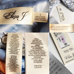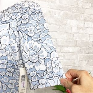 Brand New with Tags! Eliza J, Floral Lace Overlay Dress. Size 6. Scoop neck. Solid elbow sleeve lace sheath dress with low v back. Center back invisible zipper. Fully lined. Color: white/ blue.