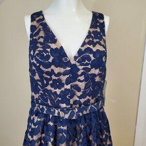 NWT Eliza J Navy Lace Illusion dress Fit & Flare Belted Cocktail sleeveless Sz 4