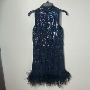 NWT Eliza J Sequin mini Dress with Feather Trim, 8