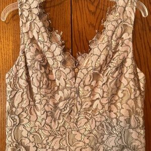 Eliza J dress tulip hem size 10. The beautiful blush pink color and delicate lace fabric make it perfect for any party or cocktail occasion. The V-neckline and sleeveless design add a touch of sophistication, while the knee-length tulip hem and lined interior ensure comfort and style.