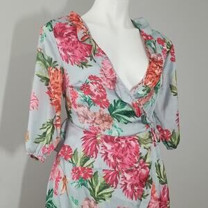 Ella Moon Floral Wrap Mini Dress new with tags. Light blue with pink floral print. Ruffle hem . Size XS