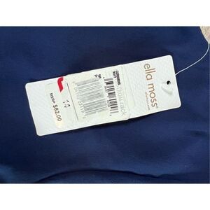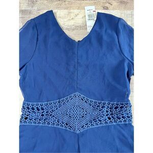NWT Ella Moss Blue Chiffon Embellished Lace Romper sz 14. Sophisticated and romantic, perfect for the fashion forward woman's wardrobe. Super cute and fun! Chiffon overlay with sheer sleeves and crochet lace waist accent. Covered button details down the front. Fully lined. 100% Polyester. Lining 100% Polyester. Lace 100% Cotton. Machine washable. Unaltered.