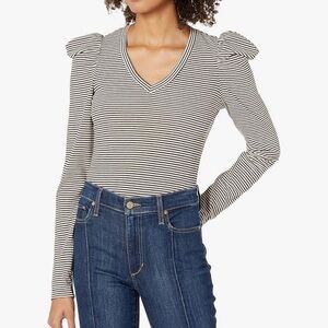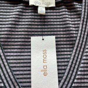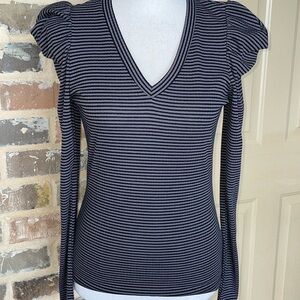 NWT Ella Moss Sandy Charcoal Striped Top Size Small. Ella Moss long-sleeved, ribbed, V-neck top featuring a black and gray horizontal striped pattern. The top has puffed shoulders and a form fitted silhouette. Brand new condition.