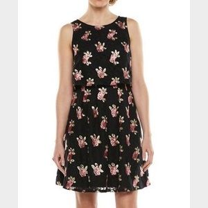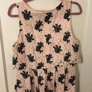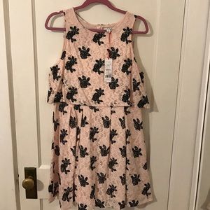 New with tags and never worn, pink pop-over dress with black floral stitching. (Model in last picture wearing the same dress in different color to show fit)