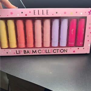 Set of Elle lip balms in vibrant colors. Includes shades of yellow, orange, pink, and purple.
