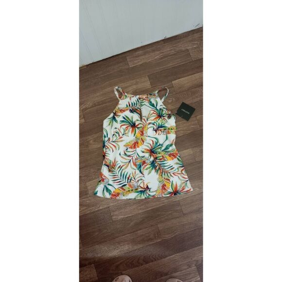 New with tags Ellen Tracy swimsuit tankini top. Super cute with green and orange tropical design on a white background. High Neck padded cups . This is for the top of a tankini set only. One piece top only.