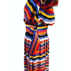 New with tags ELLIATT x Anthropologie Egality skirt set. Multicolor stripes of just about every color of the rainbow. Pleated Skirt with elastic waistband. Wrap style top with Pleated puff shoulder sleeves and belted (and buttons inside) waist. Beautiful bright colors on soft silky Satin material.