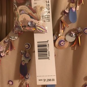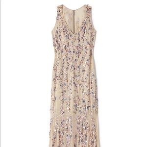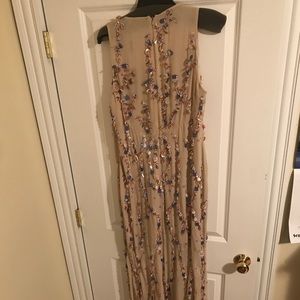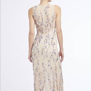 Beautiful nude with sequin gown that flows very nicely, brand new still with tags and original garmet bag, never worn, valued at $1,298.00- got it as a gift but unfortunately have no where to wear such a beautiful dress. It is a 14 but I'm a size 12 and it fits snug so it definelty runs a little small
