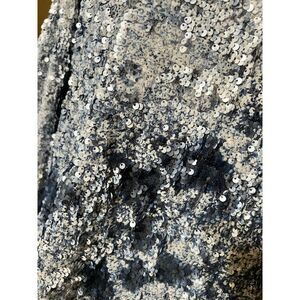 Shirt is fully sequined with bluish silver and white sequins and has a polyester lining. features a full zipper in the back. Shirt can be worn with zipper in back or zipper in front. Dry clean only. Laying flat measures 19” in the bust and 22”from shoulder to hem.