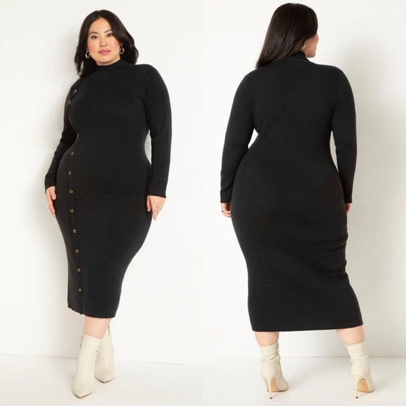NWT Eloquii Asymmetrical Button Sweater Dress Mock Neck Ribbed Black Onyx 14/16