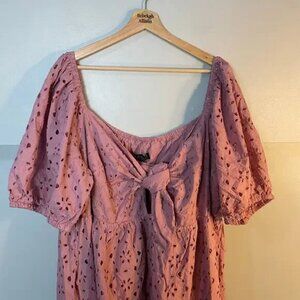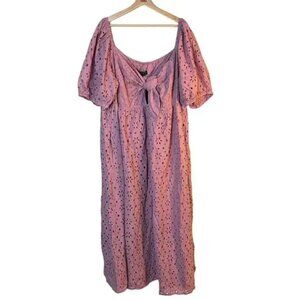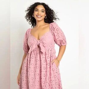 NWT Eloquii Eyelet Detail Tie Front Puff Sleeve Maxi Dress Pink Mauve SZ 28 NEW