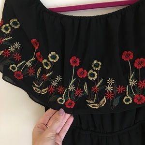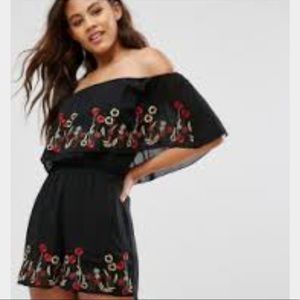 Brand new with tags, black off the shoulder romper with beautiful Embroidered detail. Fits like a M/L or a 6/8 even though size says 10.
