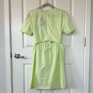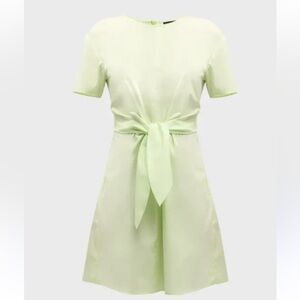 This Emporio Armani dress in a vibrant green hue features a stylish tie front and a flattering A-line silhouette. With its short sleeves and crew neck, it's perfect for casual settings or a vacation! The mini length adds a playful touch to this versatile piece. Cutout lower back.