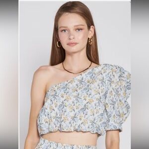 Brand new with tags! This stunning one-shoulder top by En Saison, sold through Anthropologie, features a textured floral jacquard with yellow, blue, and black embroidered blooms on a soft ivory background. Cropped with a lightly ruched hem and puff sleeve detail on one side — feminine, flirty, and perfect for brunches, dates, or garden parties.