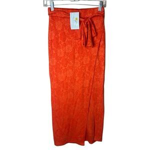 Vibrant Red/orange wrap skirt with tropical floral pattern. Side slit, attached under skirt. Perfect for a stylish look.