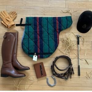 Brand new with tags. 16” - 16.5” dressage. Green, blue, red and gold striped. Blue underside. Black nylon. From a smoke free environment.