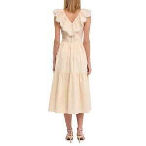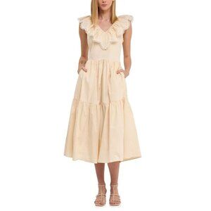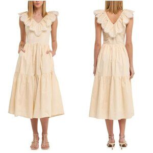 NWT English Factory Beige Ruffle Yoke Tiered Hem Midi Dress $120