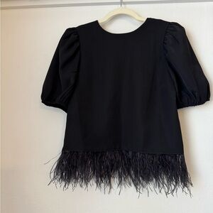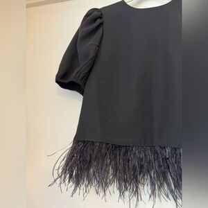 This elegant black top features a stylish feather trim, perfect for adding a touch of sophistication to any outfit. Ideal for both casual and formal occasions.