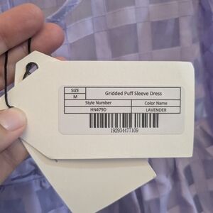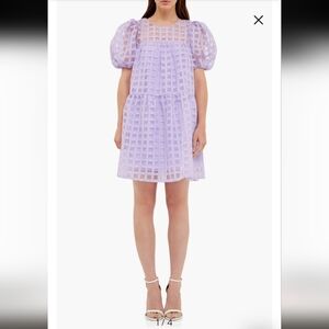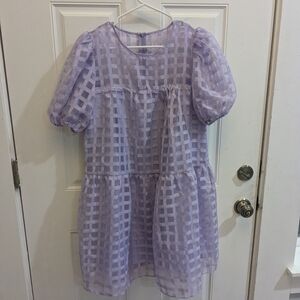 Chic lavender dress with puff sleeves and a grid pattern. Perfect for a stylish look.
